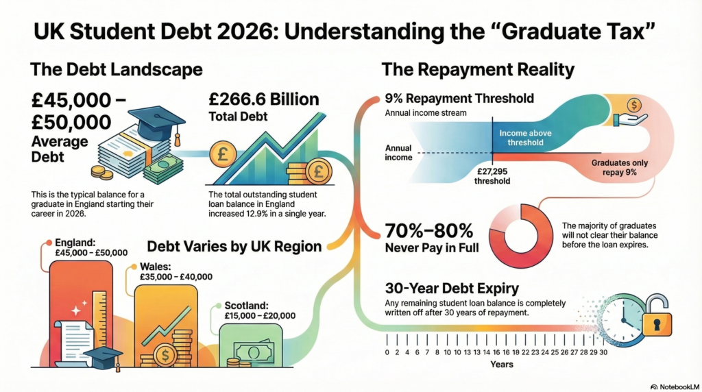 Student debt in the UK is high, with the average graduate owing around £45,000–£50,000.