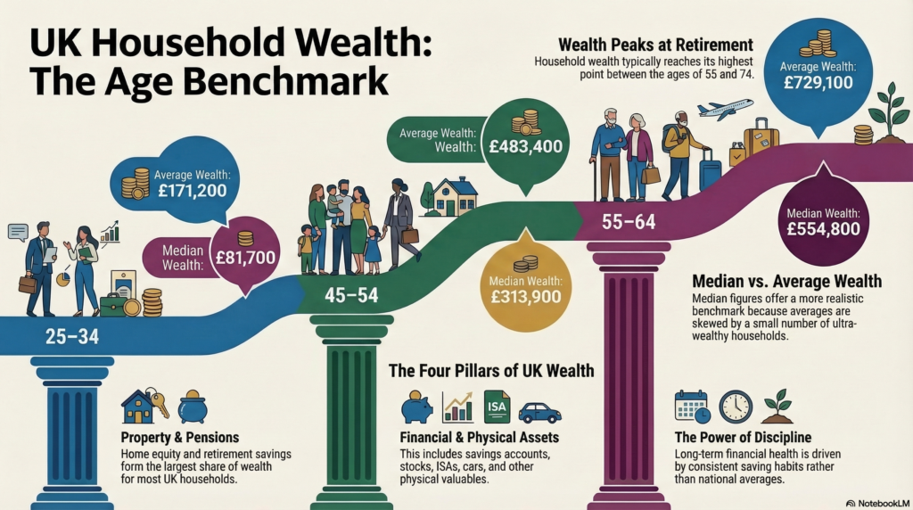 According to the Office for National Statistics Wealth and Assets Survey [Link], wealth increases steadily with age as people accumulate property, pensions, and investments.
