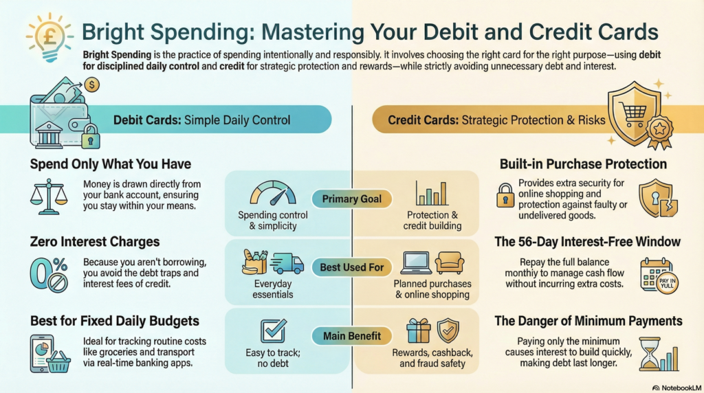 This guide explains how to practise bright spending — spending intentionally and responsibly — using debit and credit cards in the UK.